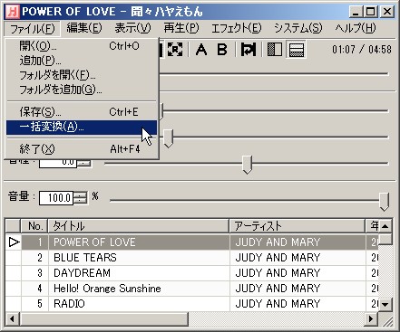 再生リストに表示されている全曲を保存する場合は、ファイル → 一括変換 メニュー から行います。
