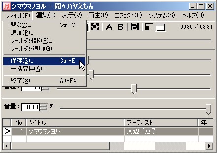 再生中の曲の保存は、ファイル → 保存 メニュー から行います。